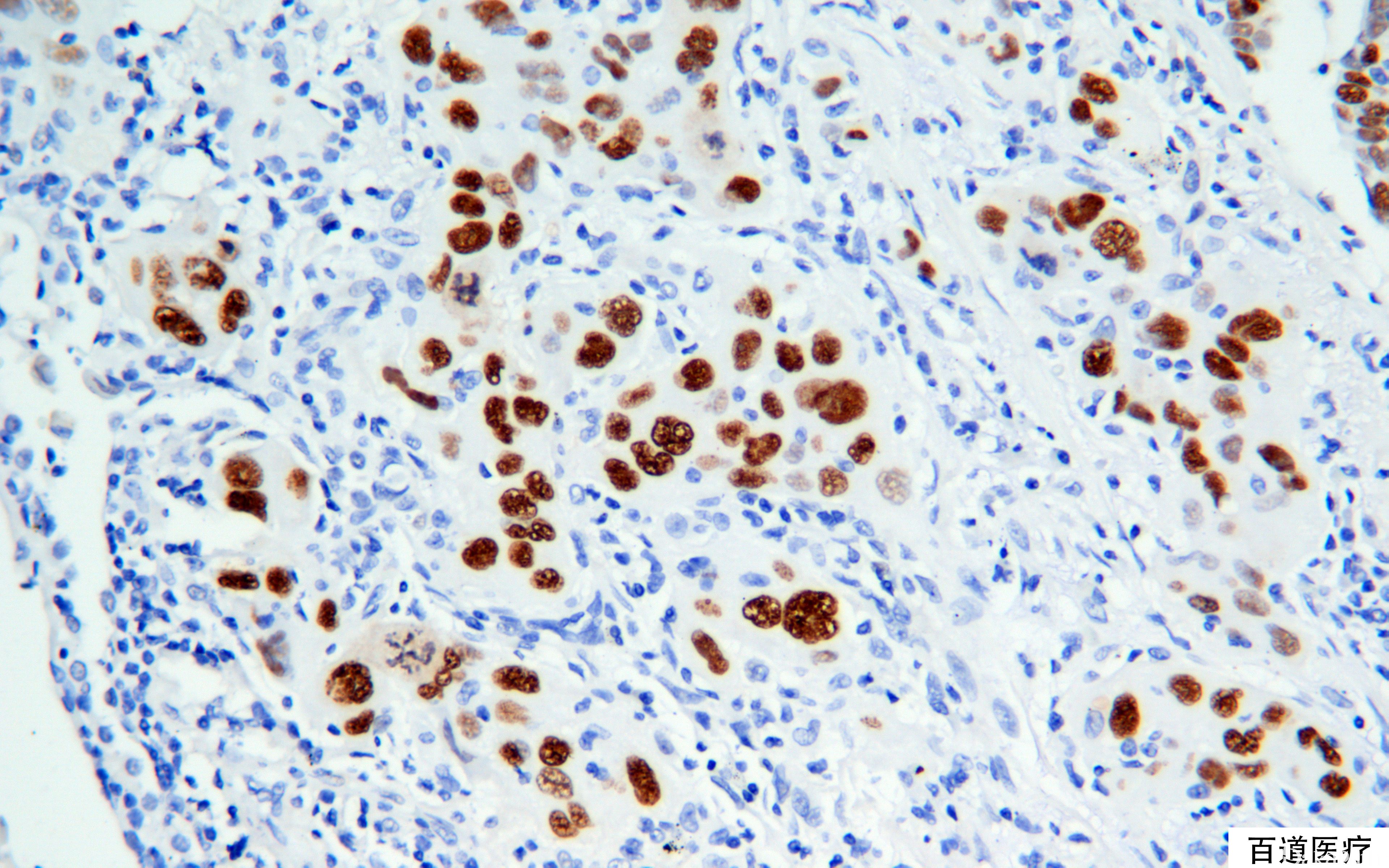 核转录蛋白,甲状腺转录因子。标记甲状腺滤泡细胞、新生儿肺及肺泡 II 型细胞。多数肺腺癌、小细胞癌阳性,肺鳞癌多阴性。肝细胞及肝细胞肿瘤的胞浆可以着色。