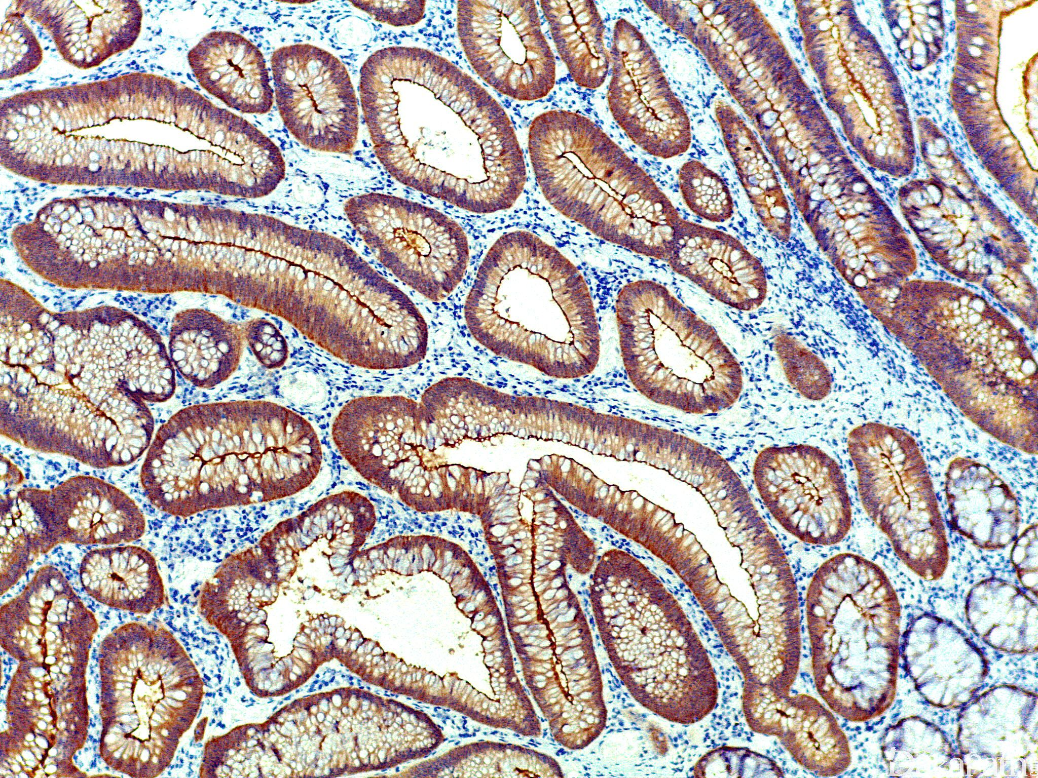绒毛蛋白是一种分子量为 95KD 的细胞骨架蛋白,为肌动蛋白结合蛋白,存在于常微绒毛细胞骨架,对保持刷状缘组织结构具有关键作用。正常分布于肠上皮和肾近曲小管上皮,可用于肠上皮来源肿瘤与非肠上皮肿瘤的鉴别诊断,亦可作为胃肠道神经内分泌肿瘤诊断的参考指标。