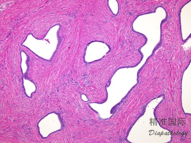 间质常为致密的纤维,局灶区域类似卵巢皮质,腺纤维瘤时间质呈纤维瘤样增生;