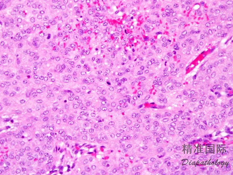 9. 少数病例可见小灶区域具有成人型粒层细胞瘤样形态,诊断时应以主要成分为依据;