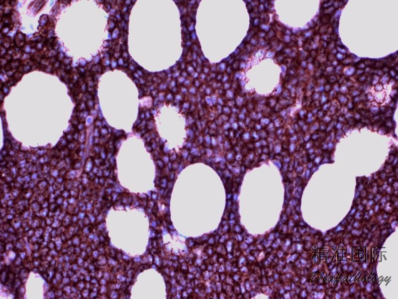 - Burkitt 淋巴瘤 :肿瘤细胞中等大小,但核仁更明显,胞质嗜碱性。表达全 B 细胞抗原,CD10 和 Bcl-6 也通常阳性,有表面轻链限制性表达。CD34 和 TdT 阴性。