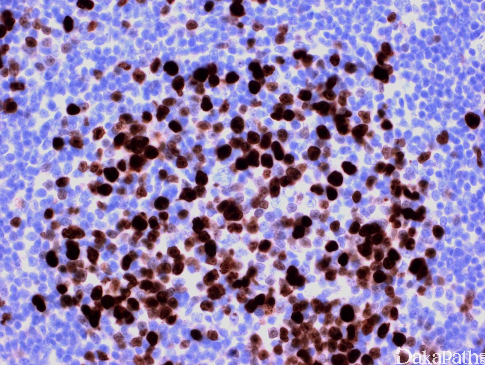 6. 大 B 细胞淋巴瘤伴 MUM1/IRF4 基因重组 (Large B-Cell Lymphoma with IRF4 Rearrangement ):主要发生于儿童和年轻成人,典型病例累及并常局限于颈部淋巴结和 Waldeyer 环。形态上可以是高级别滤泡性淋巴瘤 (3 级),或滤泡伴弥漫侵润,或弥漫增生如同弥漫大 B 淋巴细胞瘤。MUM1/IRF4 和 Bcl-6 强表达,至少半数病例表达 Bcl-2 和 CD10,少数也表达 CD5。大多数病例有 MUM1/IRF4 基因重组,常同时有 BCL-6 基因重组,但无 BCL-2 基因易位。少数病例无 MUM1/IRF4 基因重组,但有 MUM1/IRF4 强表达。侵袭性较儿童型滤泡淋巴瘤强,但经治疗后,预后良好。