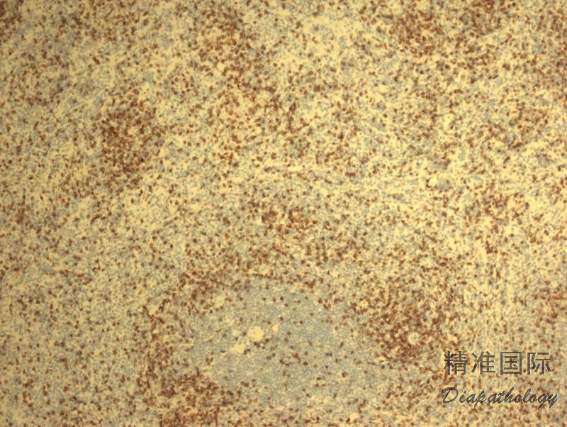 4. 骨髓累及率很高,借助免疫组化(CD20),容易发现早期的瘤细胞呈现局灶聚集和特征性窦内侵犯。