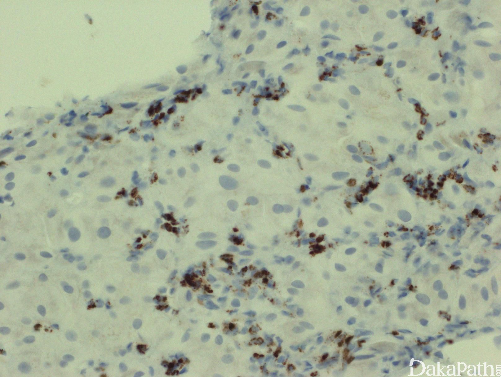 - 免疫表型:典型表型为表面 CD3+、CD2+、CD8+、CD16+、CD57+、TCRα/β(+); 少数病例可表现为 CD4+、TCR α/β+,或 TCRγ/δ+、CD8+、或 TCRCγ/δ+,CD4-、CD8-。 此外,TIA-1+、粒酶 B+、穿孔素+。常见低表达或丢失 CD5 或 CD7。 部分病例表达 KIR 家族受体。 限制性表达 TCRβ 家族谱系或异常表达 KIR 家族谱系可以作为克隆性证据。