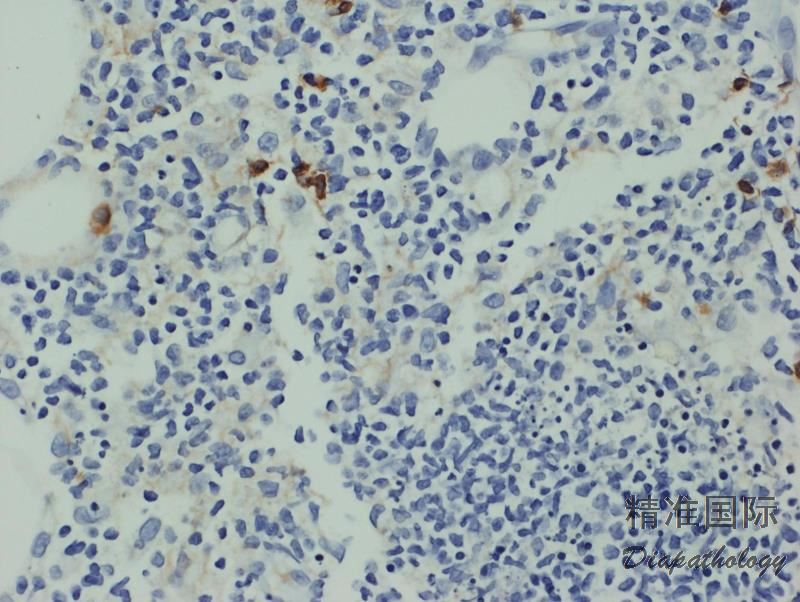 免疫表型:肿瘤细胞 CD3+、CD2+、CD56+、细胞毒分子+、TCR-δ1+、 βF1-、CD4-、CD8-(少数+)、CD5-,有的病例可 TCR-δ1+、 βF1+,EBER-。