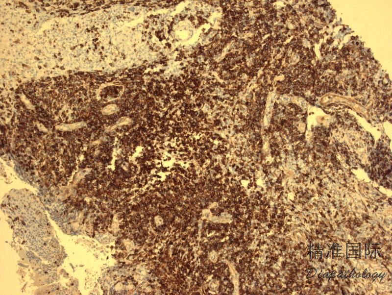 原发性皮肤 γ/δT 细胞淋巴瘤 (Primary cutaneous γ/δT cell lymphoma):临床表现为侵袭性,肿瘤主要侵犯四肢可也累及全身皮肤和内脏。肿瘤细胞可侵润表皮、真皮或皮下,表达 CD3. CD56. CD2. TCRδ,不表达 CD4. CD8(少数+)、CD5. βF1。