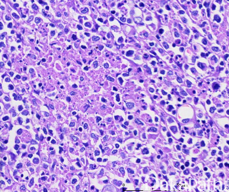 坏死型:为最常见组织学类型。表现为副皮质区不含中性粒细胞浸润的片状坏死,有大量的被单个核细胞围绕的核碎裂碎片,核碎裂碎片可位于组织细胞外或被组织细胞吞噬。