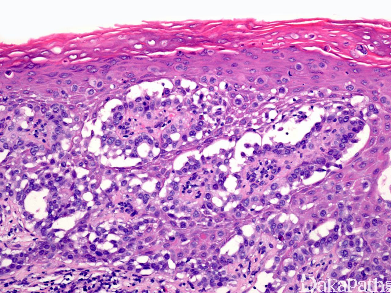 组织学特征性地表现为表皮内非典型上皮细胞单个散在或成群分布于上皮各层内,有时可形成导管或腺样结构;