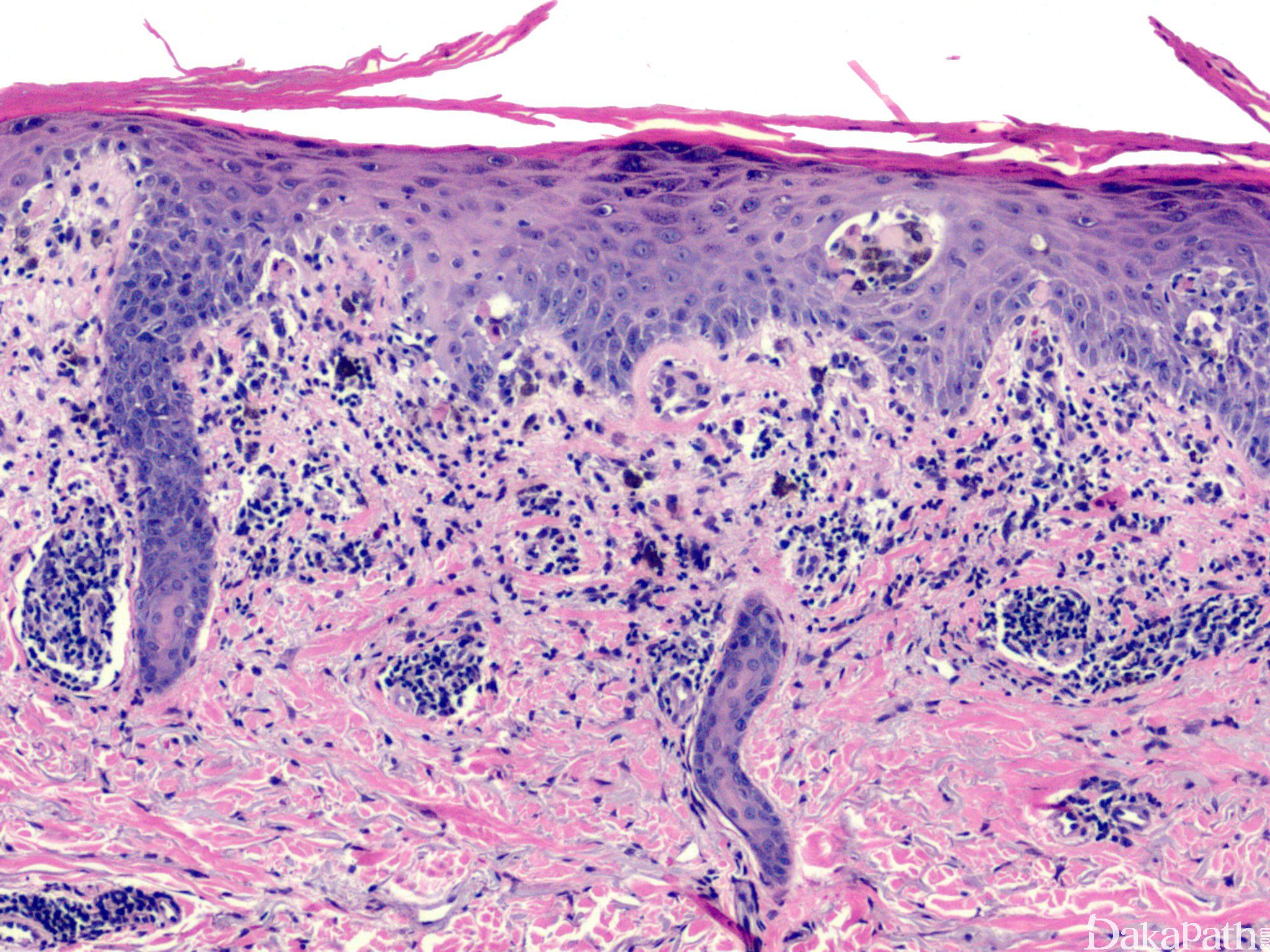 浸润性炎症细胞中常含有噬黑色素细胞,并且有时可明显,特别是当其他炎症细胞很少时,因而类似于色素性病变。