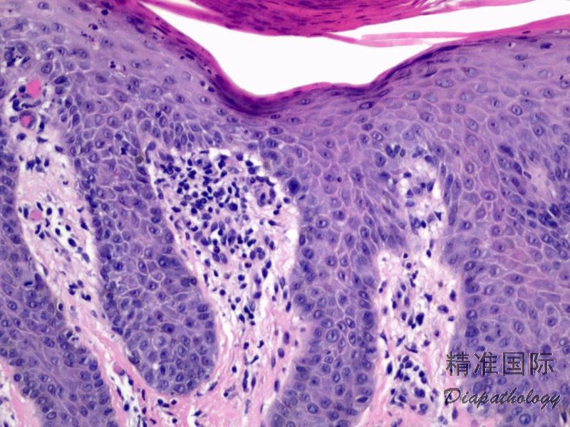 4. 免疫性水疱性疾病和感染 :海绵水肿性皮炎比银屑病更容易化脓,因此,其中性粒细胞结痂中口可以见到球菌聚集。坏死松解性游走性红斑偶尔可表现为典型的银屑病样皮炎和中性粒细胞性海绵水肿,而无明显的坏死松解。与银屑病相比,其表皮上层通常更显苍白。