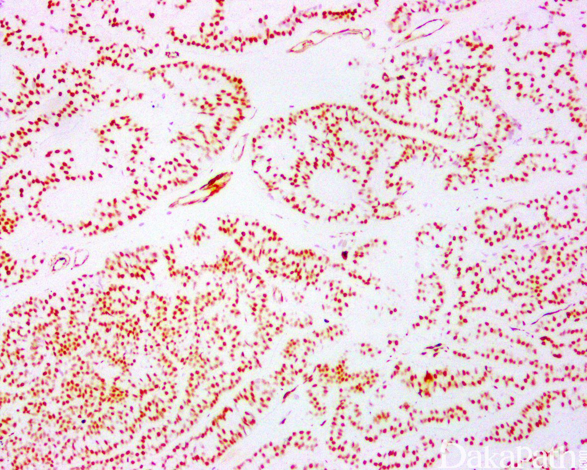 calretinin、SF1. CD99. melan A、WT-1. CD10. vimentin、S100 通常阳性,50%病例 inhibin 阳性,多数病例 CgA、Syn、AE1/AE3. 核 β-catenin、核 SOX9 阳性。PLAP、Podoplanin (D2-40)、OCT3/OCT4. SALL4. α-fetoprotein、CD30 (BerH2)及 HCG 均阴性。