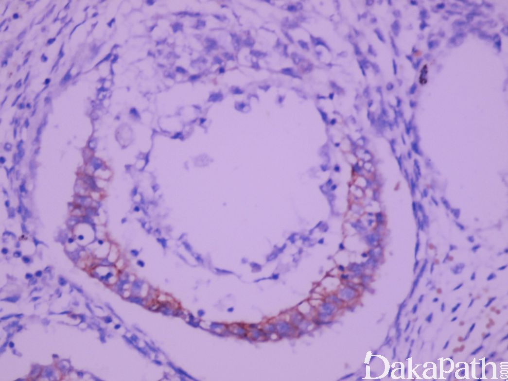 - 显微镜下可见大量散在胚胎样小体,该小体中央为盘状胚胎癌细胞(1-4 层厚),“背侧”可见被覆扁平上皮的羊膜腔(偶尔可被覆为肠型或鳞状上皮),“腹侧”为卵黄囊样囊腔,内含网状或黏液瘤样卵黄囊瘤成分;