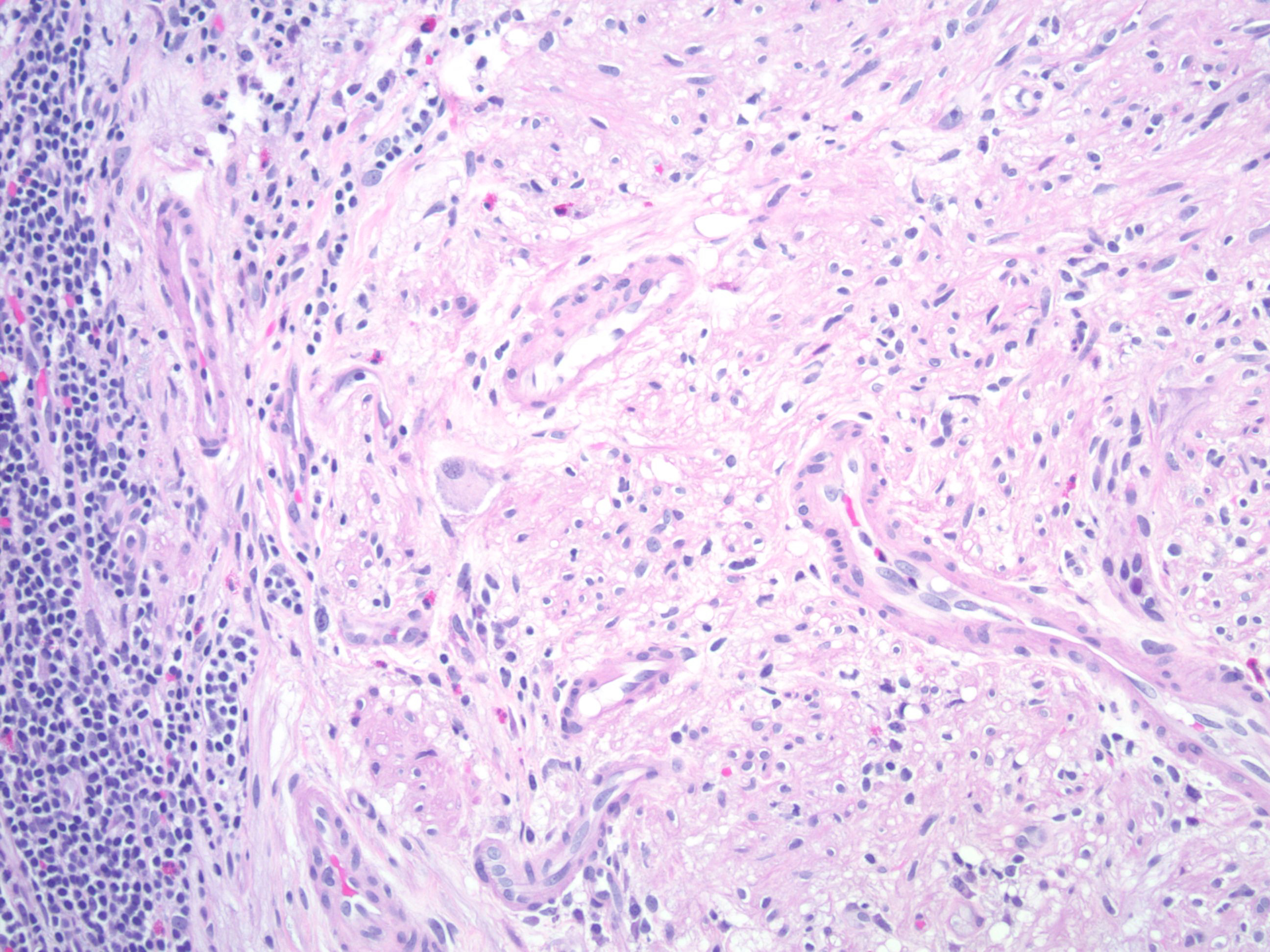 4. 良性** **纤维母细胞性息肉 / 神经 束膜瘤: 位于固有层,缺乏 S100,外周神经束膜标记 EMA, claudin-1, collagen IV 均阳性。