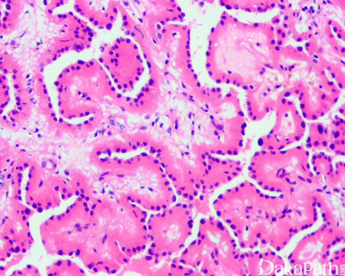 乳头被覆单层立方状肿瘤细胞,具有丰富的嗜酸性颗粒状胞浆,部分可见胞浆内空泡,肿瘤细胞具有特征性的核,核位于远离基底膜的瘤细胞的胞浆顶端,乳头或小管腔面平滑;