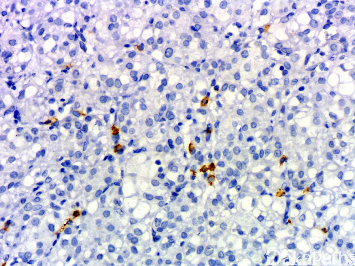 诊断 SDH-RCC 需要存在 SDHB 的免疫染色丢失,在判读 SDHB 免疫组化表达时需要与周围的正常组织作比较,只有周围组织对照阳性且肿瘤细胞完全阴性时才能判读为 SDHB 表达丢失。罕见的情况下,当 SDH-RCC 与 SDHA 基因突变相关时,肿瘤除了 SDHB 表达缺失之外,SDHA 免疫组化表达也缺失。SDH-RCC 弥漫表达 PAX-8 和肾特异性粘附蛋白,仅 30%表达广谱 CK,不表达 CK7,C-KIT, E-cadherin, 波形蛋白,CD10 等