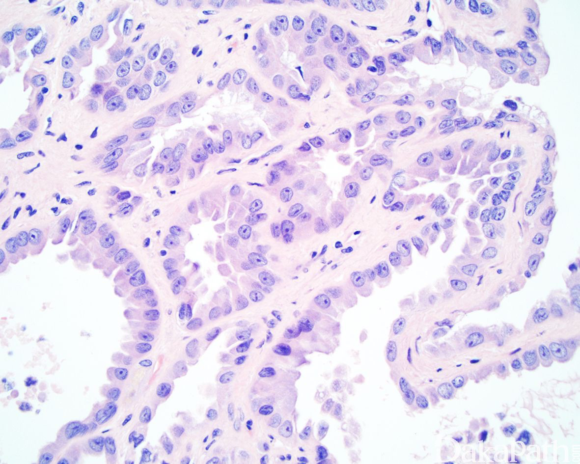 4. 低倍镜下完全由小到中等大的小管和较大的囊肿组成(图 1);被覆瘤细胞单层排列,呈扁平、立方状到柱状、鞋钉样不等(图 2)。管腔或囊腔内容物空,有时可见浅染的嗜酸性分泌物或出血。
