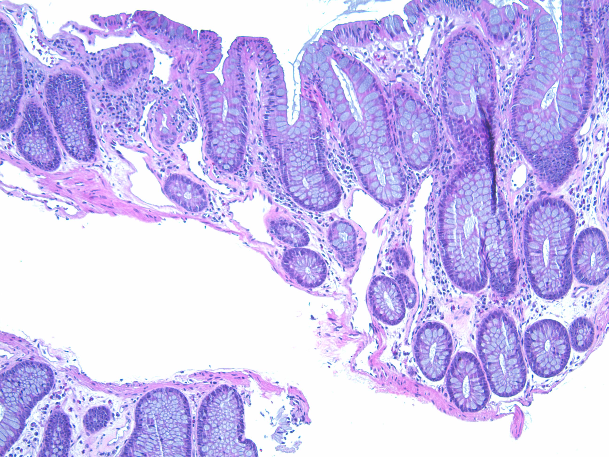2. 组织学上急性损伤黏膜及固有层嗜酸性粒细胞浸润,隐窝受损及萎缩类似于霉酚酸酯结肠炎或移植物抗宿主疾病,少数活检时处于自限性状态。慢性改变可见毛细血管扩张伴不典型性内皮细胞,固有层及血管玻璃样变,不典型间质细胞(放射性的纤维母细胞),损伤愈合后可见腺体结构变形类似炎症性肠病,肠壁深层动脉受损可见内膜增生、血栓形成及纤维化,动脉受损导致缺血的改变,瘢痕的形成。纤维化及瘢痕的形成引起小肠梗阻及继发性细菌繁殖。