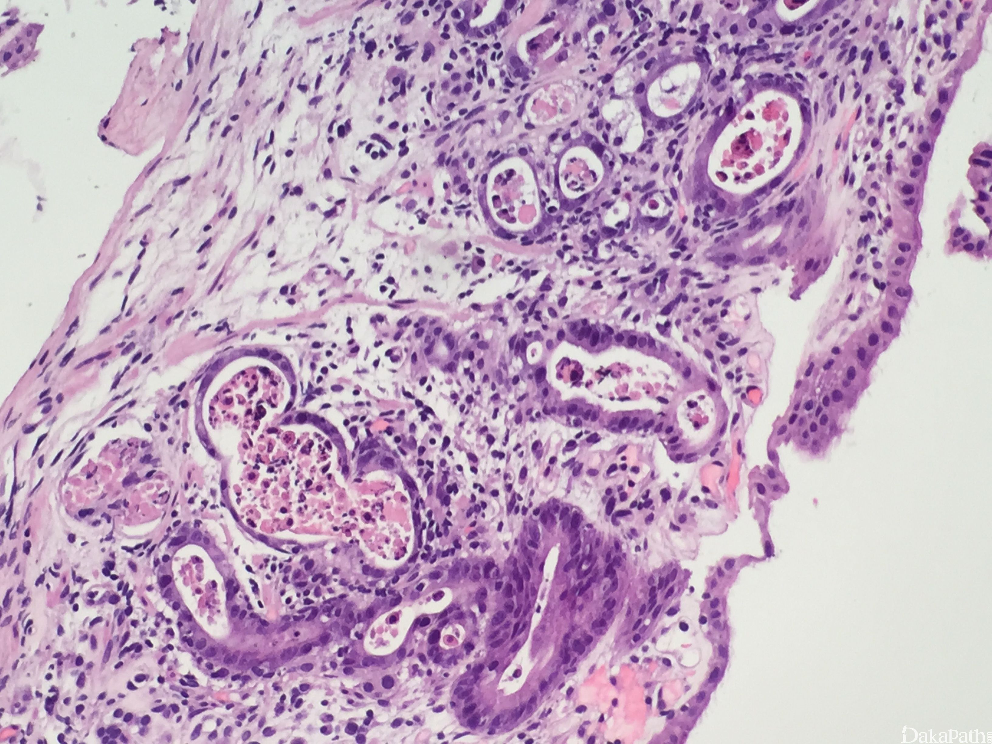 7. Cord 结肠炎综合征 :由于根瘤菌感染导致,持续性腹泻,对抗生素有效,伴中性粒细胞浸润的肉芽肿性炎,可见类似 IBD 的隐窝变形及潘氏细胞化生。