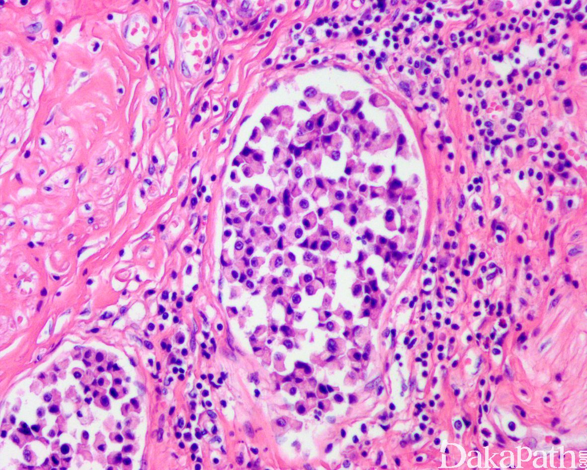 3. 肿瘤细胞胞质透亮或嗜酸性,核大、中位或偏位,具有小核仁,似浆细胞或淋巴细胞,多形性不明显;