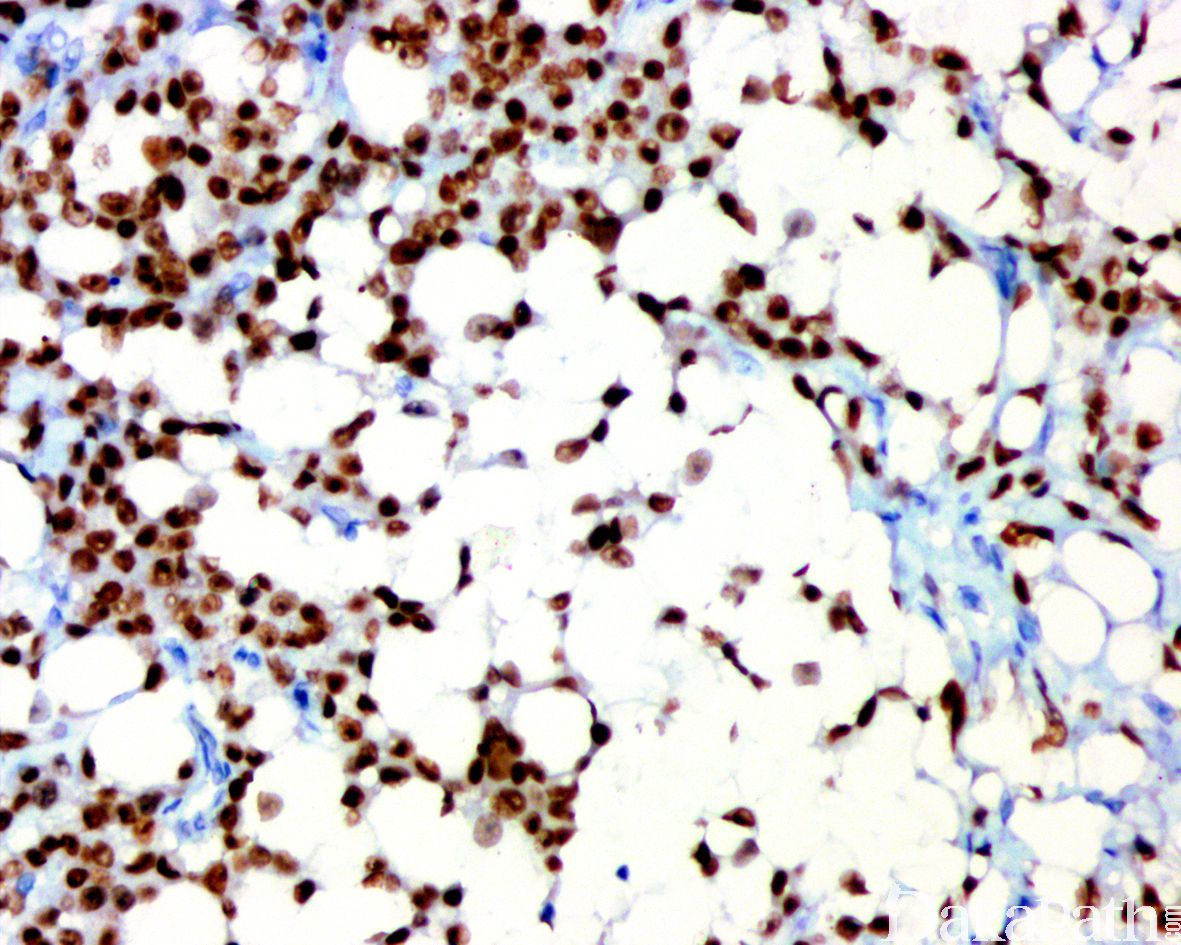 表达 AE1/3,P63,CK7, thrombomodulin, EMA,Cam5.2,CK20 和 GATA3,Vimentin 和 S100 阴性,黏液染色阴性。