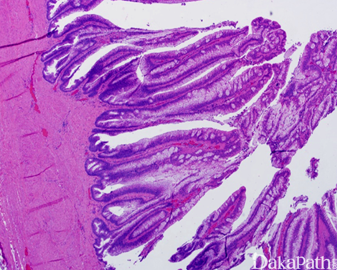 3. 镜下呈具有纤维血管轴心的乳头状结构,或尖锐或钝性指状突起,被覆肠型上皮;有时可表现为管状腺瘤或管状绒毛状腺瘤;