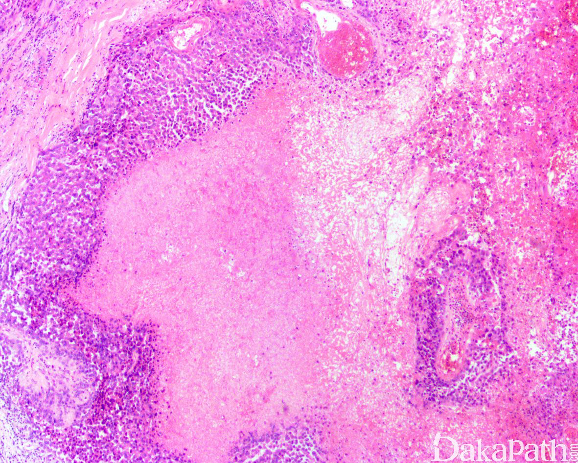 瘤细胞呈结节状或花环样排列,结节周围围绕胶原纤维,结节中央常伴有坏死;