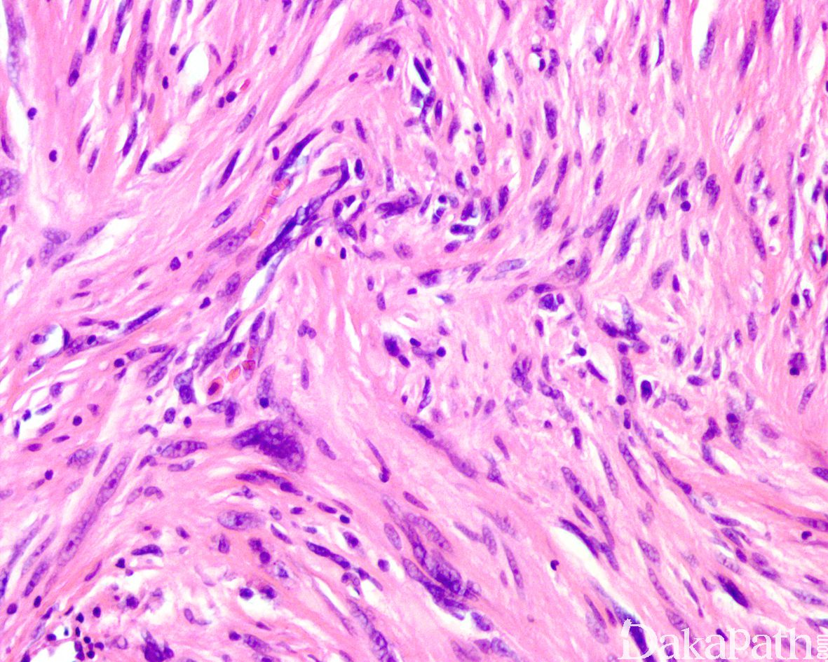 瘤细胞梭形至上皮样,呈束状或实性片状排列,胞浆丰富呈颗粒状、原纤维状或玻璃样改变,部分表现为黄瘤样胞浆;