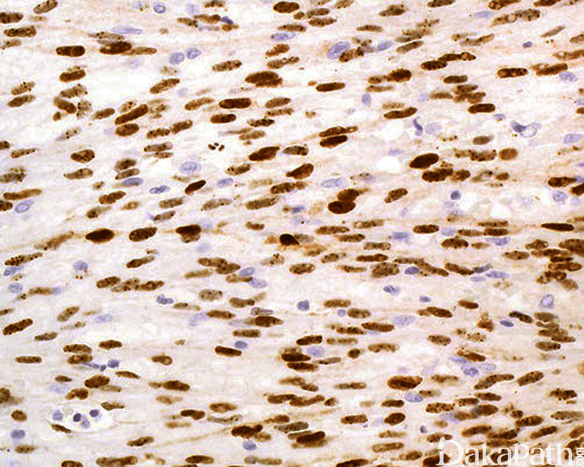 vimentin、ERG、CD31. CD34. VEGFR-3. FLI-1. PAL-E、抗 E92. FKBPl2. D2-40 阳性。无论哪种类型的 Kaposi 血管肉瘤均显示 HHV8 的相关性,玻璃样小球免疫组化染色表达 HHV8, PAS 染色阳性(耐淀粉酶消化)。CK,SMA 阴性。
