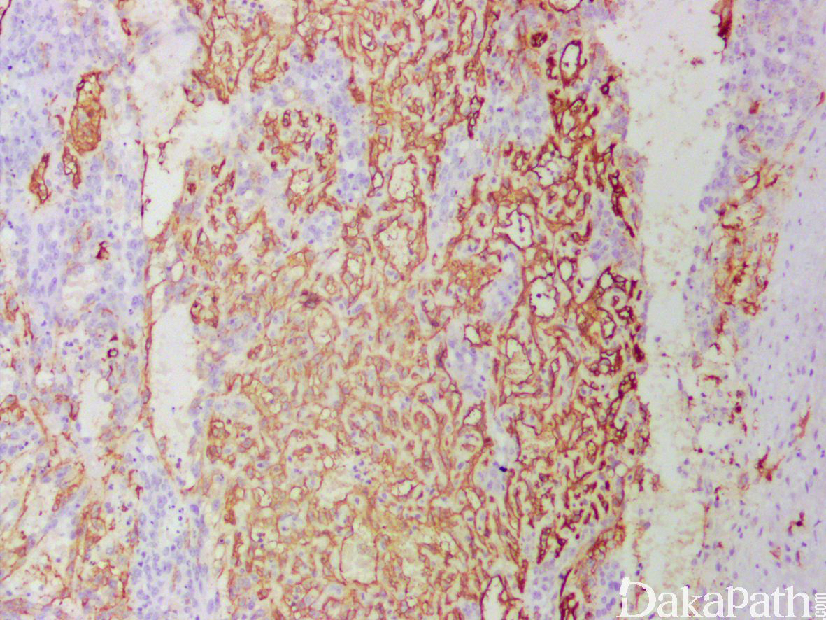 肿瘤性血管形态不规则,通过血窦结构互相连通,并破坏浸润周围组织,有些区域血管的肿瘤性内皮细胞过多,形成出芽、突起或乳头;