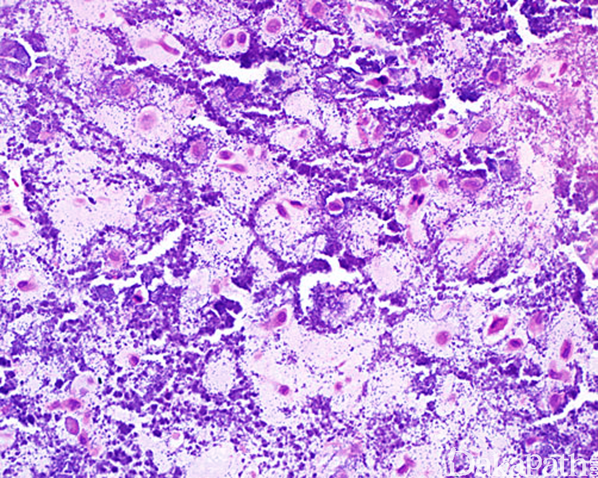 一些病例内软骨细胞相对较为丰富,且细胞体积较大,可见核沟或核裂,含有多少不等的软骨样基质,常见围绕软骨细胞的钙化,肿瘤内常可见散在分布的破骨样巨细胞,形态上类似软骨母细胞瘤,也称软骨母细胞瘤样软骨瘤(chondroblastoma-like chondroma)。