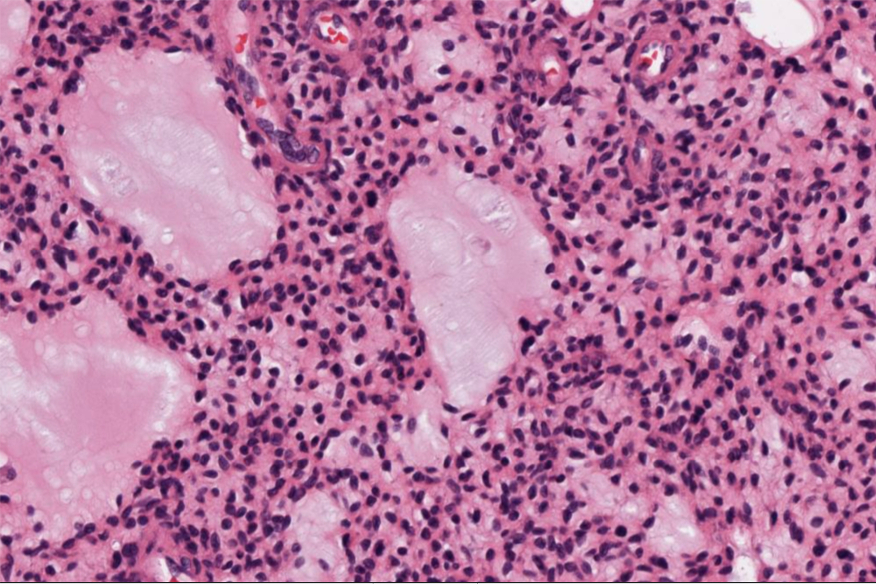 - 肿瘤细胞梭形及星状,疏松状排列,可产生特征性的“污浊”或絮状基质,常伴有钙化;