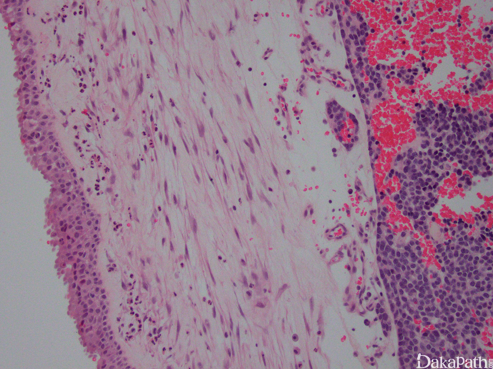 鼻窦未分化癌 (SNUC) 高级别,具有广泛破坏性,大量凝固性坏死及血管浸润,弥漫角蛋白强阳性,可显示少量神经内分泌标记。